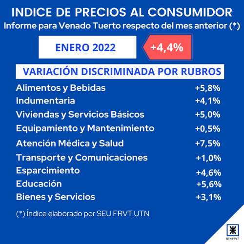 El relevamiento de precios que desarrolla el Centro de Estadísticas de la Facultad Regional para Venado Tuerto, arrojó una suba del 4,4 % a nivel general, correspondiente a enero de 2022. Enero resultó la continuación de un diciembre muy turbulento, impactando en todos los capítulos y con subas muy altas.