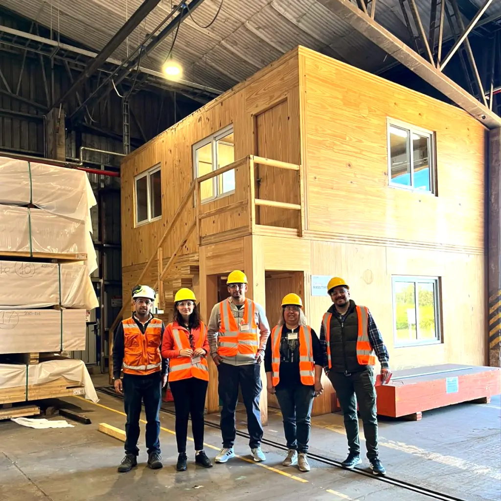 Asimismo, el equipo fue acompañado por el Ing. Michael Romero Vilches de Arboreal, quien brindó un recorrido técnico por la planta industrial, mostrando los procesos productivos y las líneas de desarrollo de la empresa. Arboreal es una empresa integrada verticalmente, que opera desde el aserradero hasta el diseño de edificios, especializándose en el suministro de productos de ingeniería de la madera. Entre ellos se destacan los paneles de madera contralaminada (CLT) y las vigas laminadas encoladas (GLT). Estos productos mantienen una estrecha relación con los proyectos de investigación del GIDEC y con la tesis doctoral de la Ing. Andrea Tosco, fortaleciendo la cooperación entre la industria y la investigación académica.